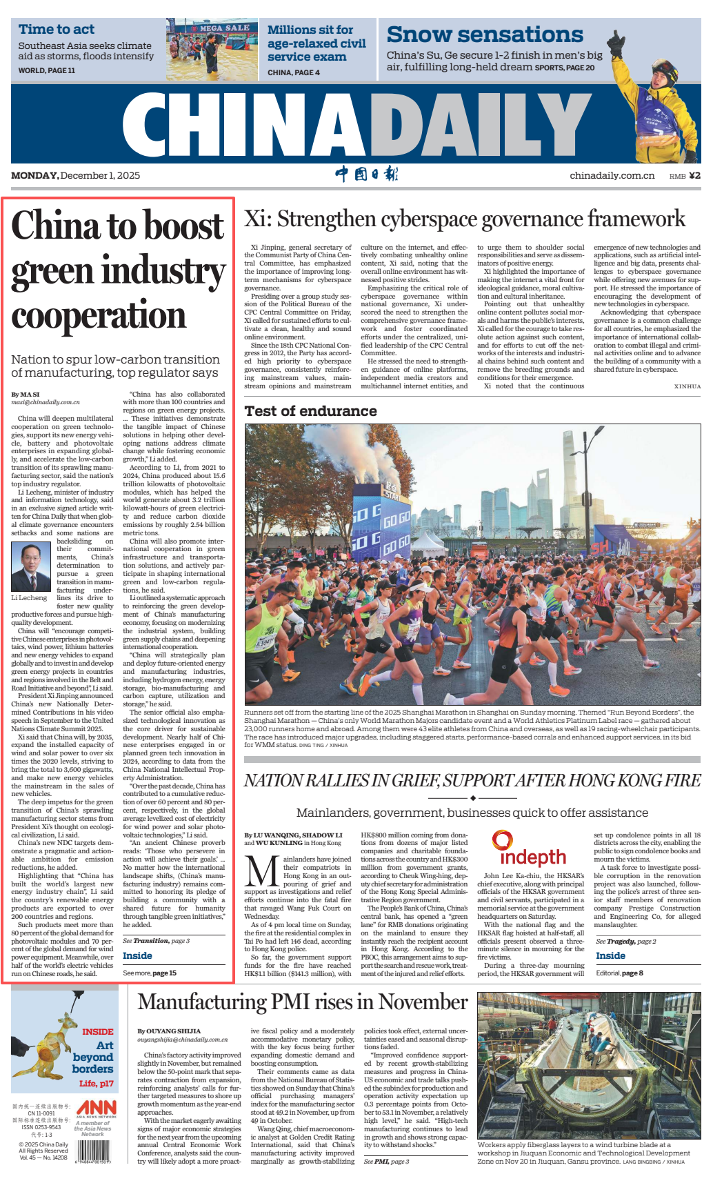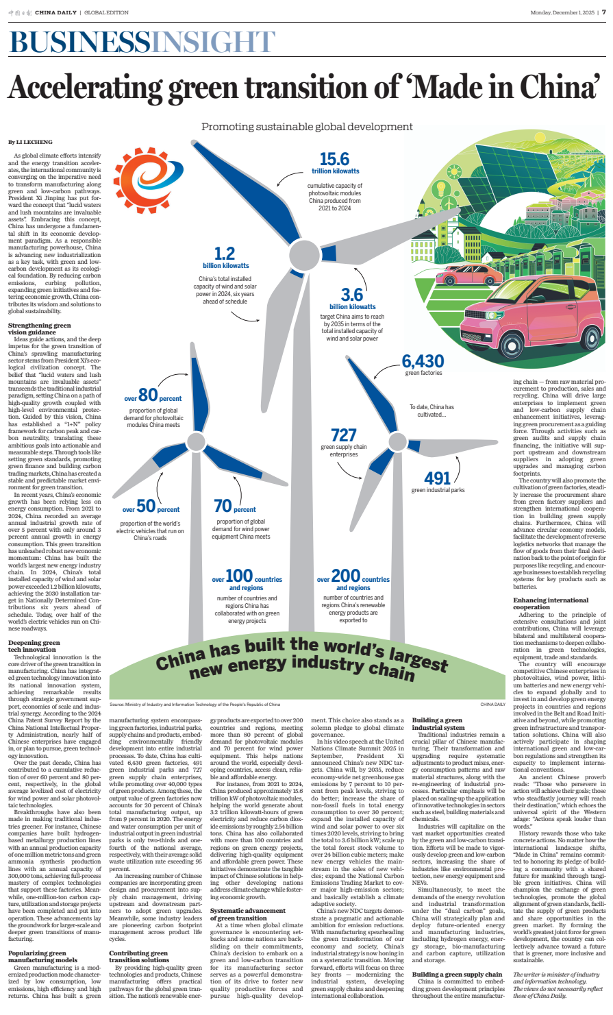12月1日,《中国日报》刊发工业和信息化部党组书记、部长李乐成英文署名文章,题为《加快中国制造绿色低碳转型 促进全球可持续发展》。全文如下: