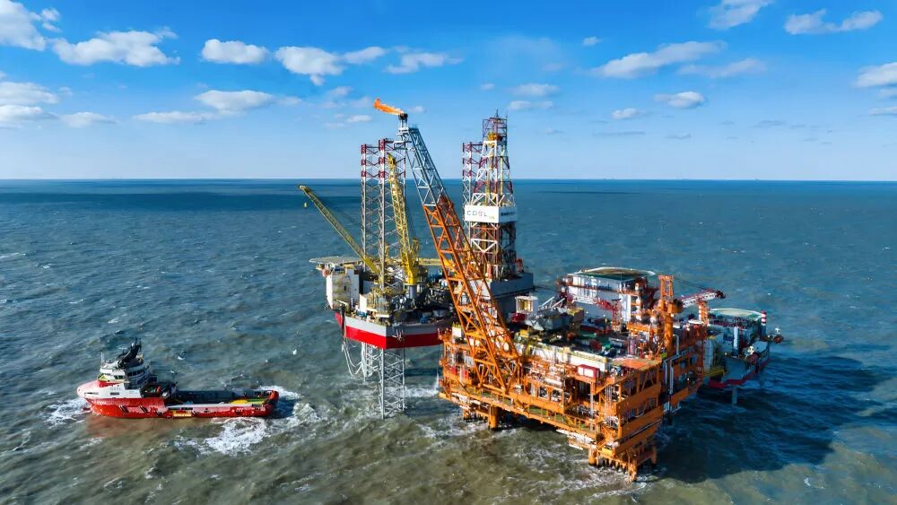 这是2025年2月8日拍摄的渤中26-6油田一期开发项目海上作业平台(无人机照片)。新华社发(杜鹏辉 摄)