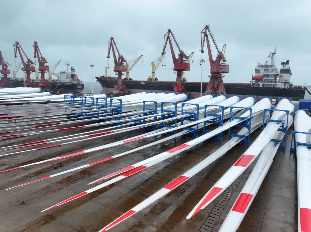 2025年10月13日,在江苏省连云港港东方港务分公司码头,大批风电设备集港准备装船出口国外(无人机照片)。新华社发(王春 摄)