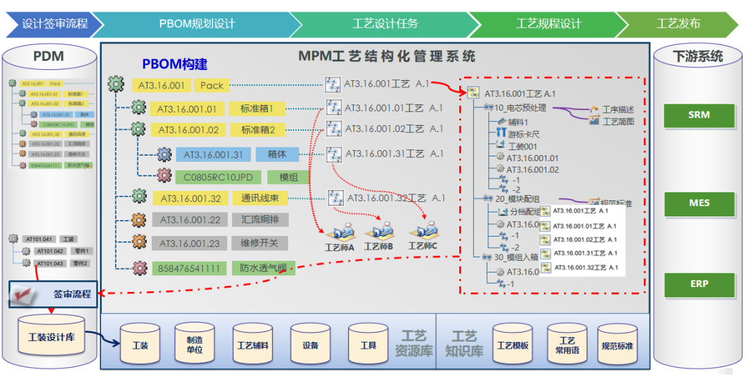 场景描述:以工艺平台为载体,结构化管理工艺资源数据,向上对接研发数据管理的PLM,向下对接MES、ERP、SRM等系统,实现研发-工艺-制造的全数字化流程贯通,打破跨部门协作的壁垒,有效支撑研发设计与工艺更改协同,确保工艺更改闭环,提升锂电池生产效率。