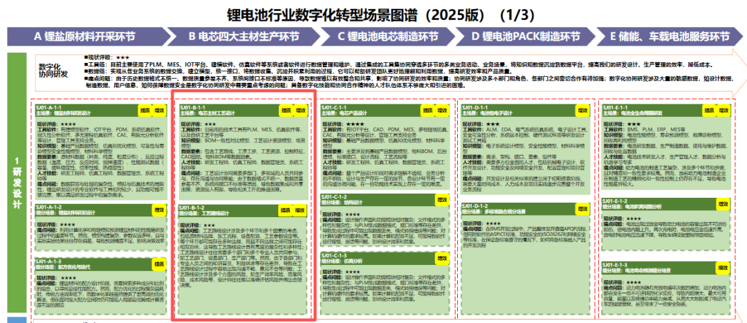 工业和信息化部9月16日印发《场景化、图谱化推进重点行业数字化转型的参考指引(2025版)》,其附件中给出14个行业场景图谱(2025版),为各行业数字化转型应用实践提供了方法指引。锂电池行业数字化转型场景图谱涉及研发设计、生产制造、运维服务、经营管理、供应链管理等5个关键环节、73个典型场景。现对锂电池行业的典型场景进行解读。