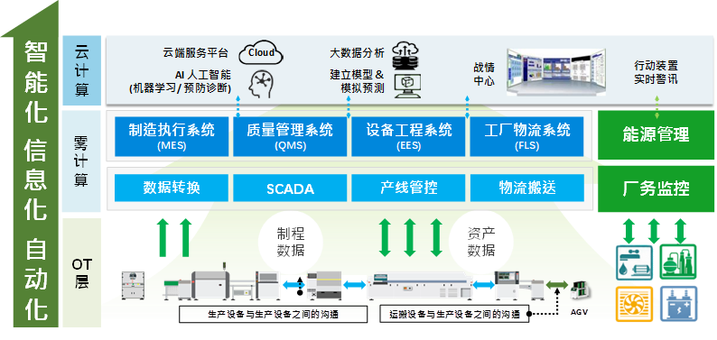 硬件方面,提供电子组装行业整线设备解决方案,包括镭雕、锡膏印刷机、回流焊、SPI锡膏检测、贴片机、插件机、选焊/锡炉、ICT (电性测试)、分板、AOI外观检测、老化测试等设备。